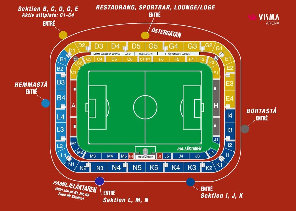 Bortaläktaren ligger på norra kortsidan och biljett finns endast att köpa online HÄR. Ni med bortakort går direkt till insläppet till denna sektion.