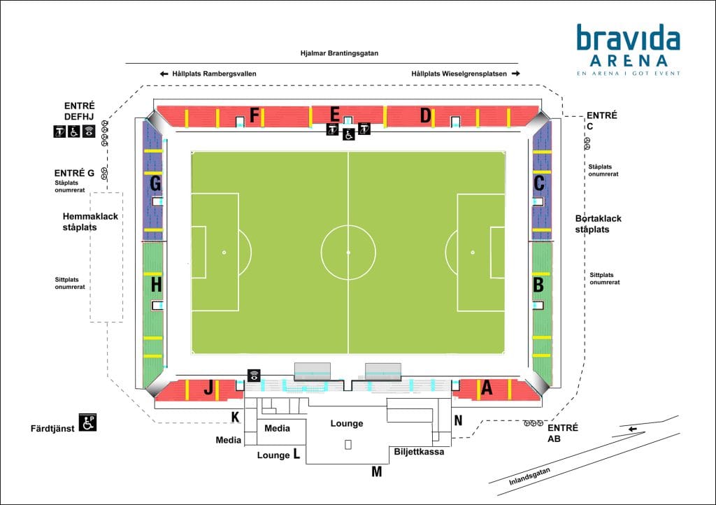 Bortasektionen (ståplats) finns på sektion C, och supportrar med bortakort går direkt in via detta insläpp. För dig som vill sitta rekommenderas sektion D, med entré vid hörnet intill Lundbybadet.