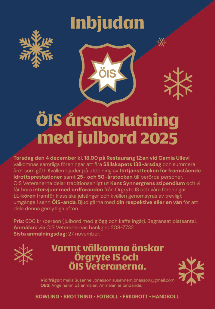 ÖIS 1887 och ÖIS Veteranerna bjuder in till traditionsenligt julbord på Sällskapets 138-årsdag.