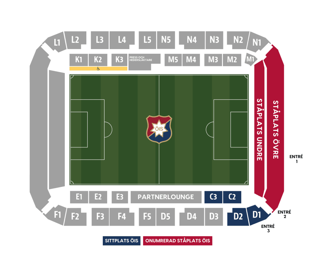 För ÖIS supportrar gäller entré 1, 2 och 3. För smidigast tillträde till bortasektionerna rekommenderas att man går bakom Polishuset och följer anvisningarna genom ”bortafållan”. Det är även möjligt att ta sig till bortasektionerna via Heden.