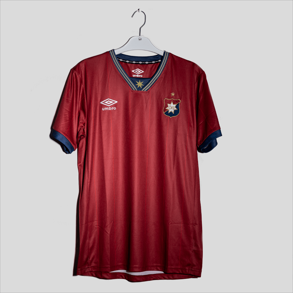 Sällskapets hemmatröja 2024. För fjärde året i rad framtagen tillsammans med vår materialpartner Umbro. Tröjan är i ÖIS karakteristiska mörkröda nyans för kärleken parad med den blå för troheten.