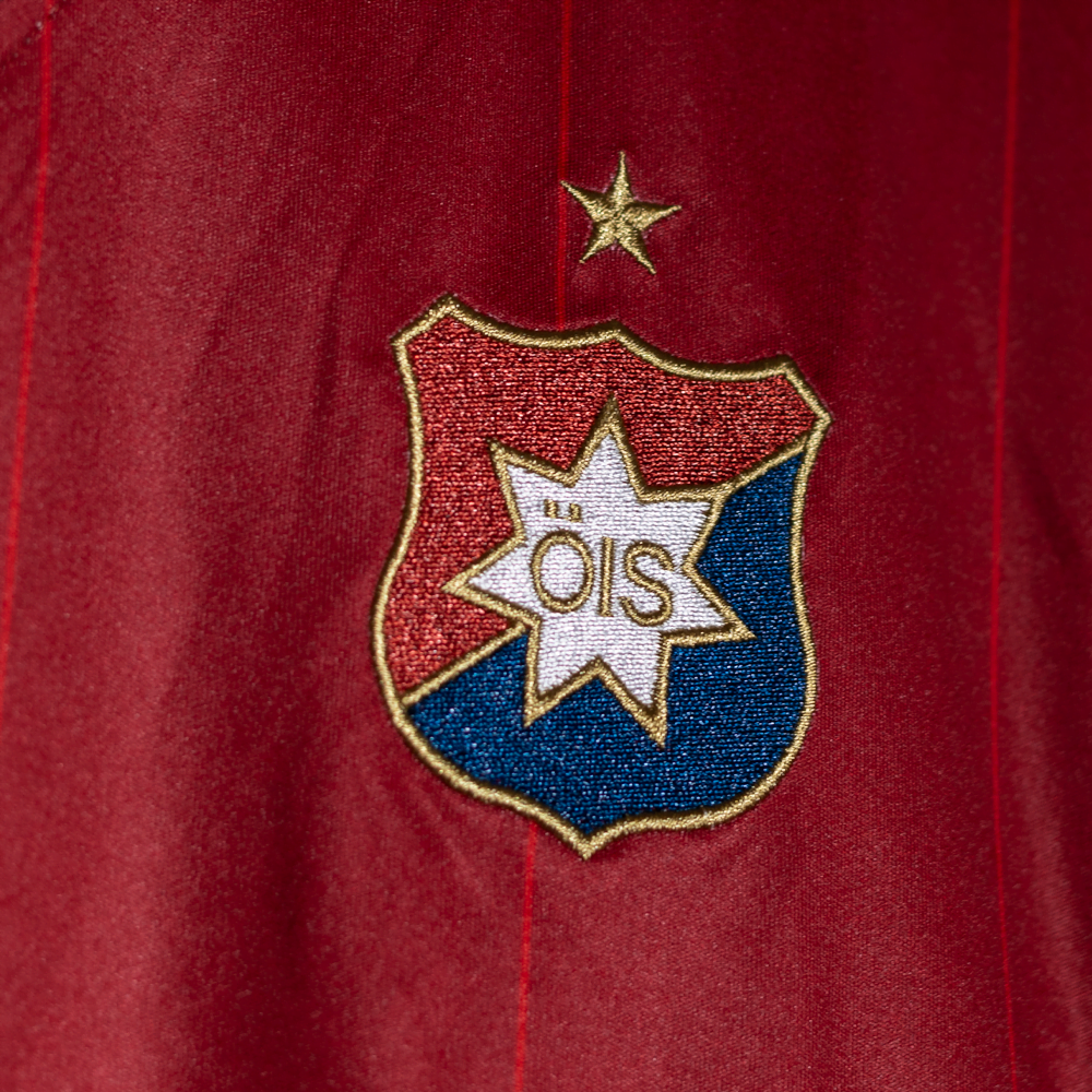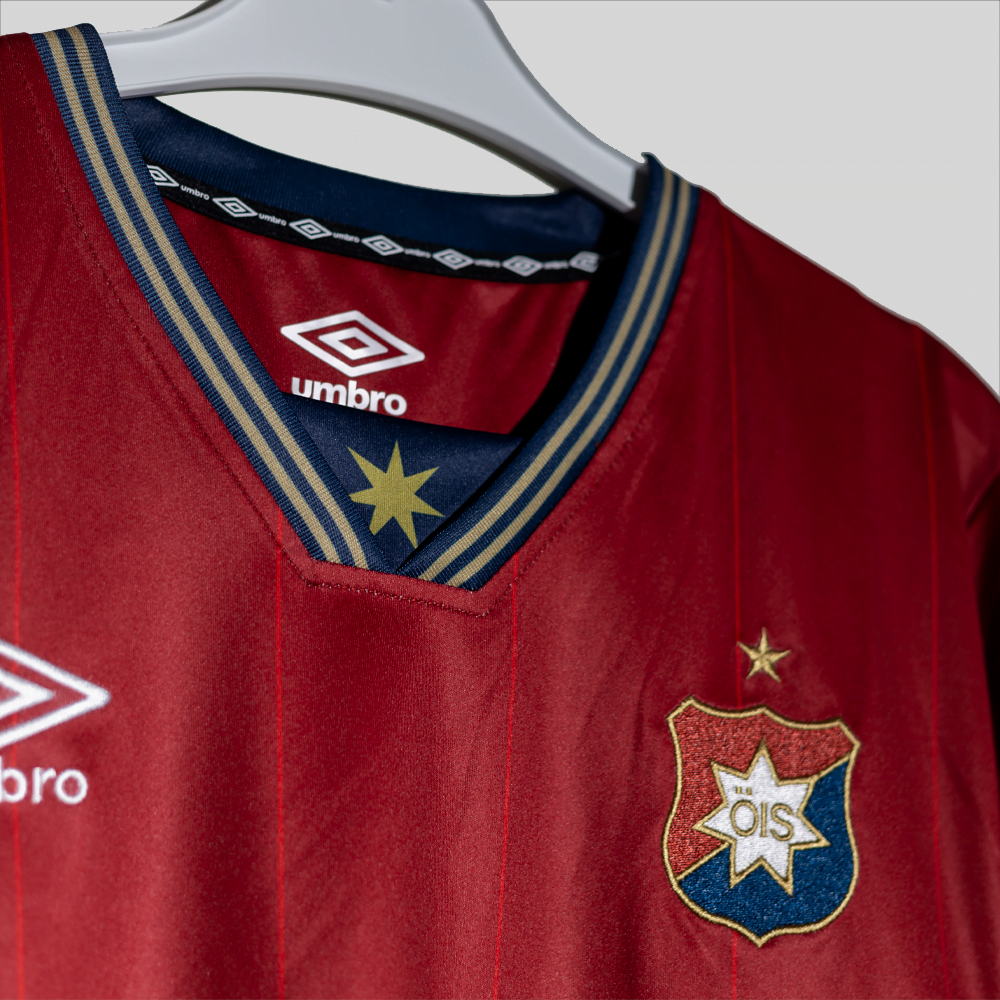 Sällskapets hemmatröja 2024. För fjärde året i rad framtagen tillsammans med vår materialpartner Umbro. Tröjan är i ÖIS karakteristiska mörkröda nyans för kärleken parad med den blå för troheten. Även 2024 återfinns den sjuuddiga stjärnan från vårt första emlem såväl i halsen som ton i ton på den blå mudden i ärmen.