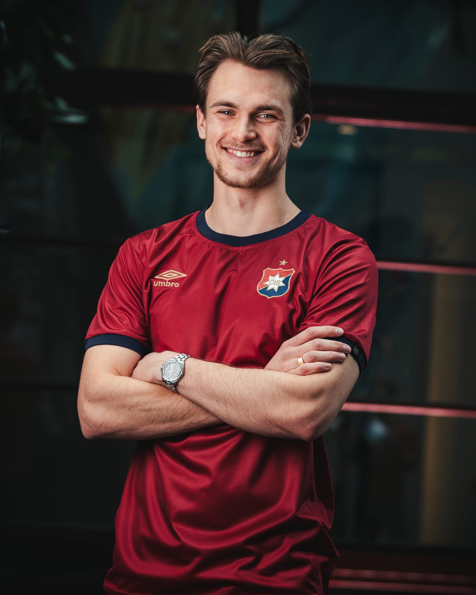 Sällskapets hemmatröja 2026. En röd matchtröja med rund, blå hals och blå ärmslut.