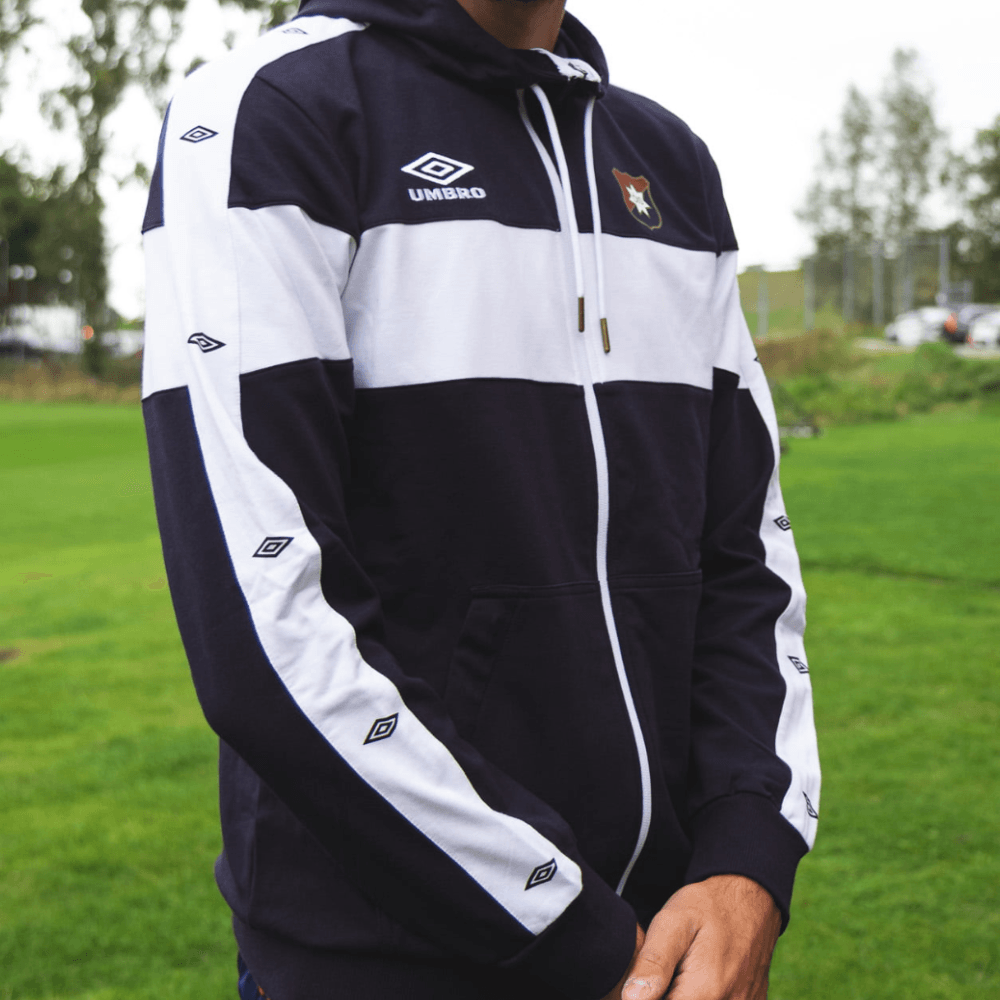 Hoodie med liten ÖIS-sköld på vänster bröst Mörkblå och vit luvtröja med en blandning av teknisk bomull och polyester, samt French terry på insidan. Umbro diamant-print på ärmarna och stor Umbro-logo på ryggen.