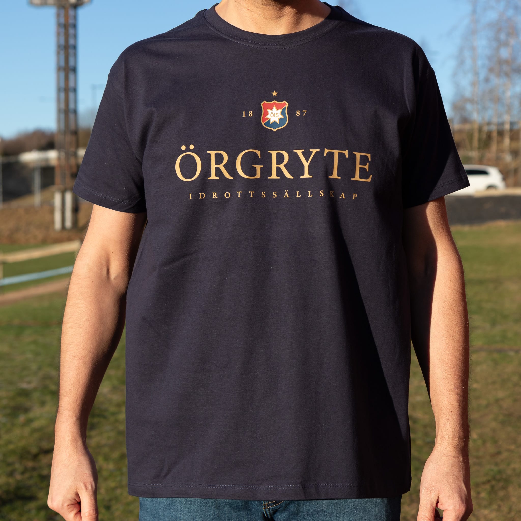 Blå bomulls t-shirt med elegant tryck av skölden omgivet av årtalet 1887 samt texten ÖRGRYTE IDROTTSSÄLLSKAP i guld.